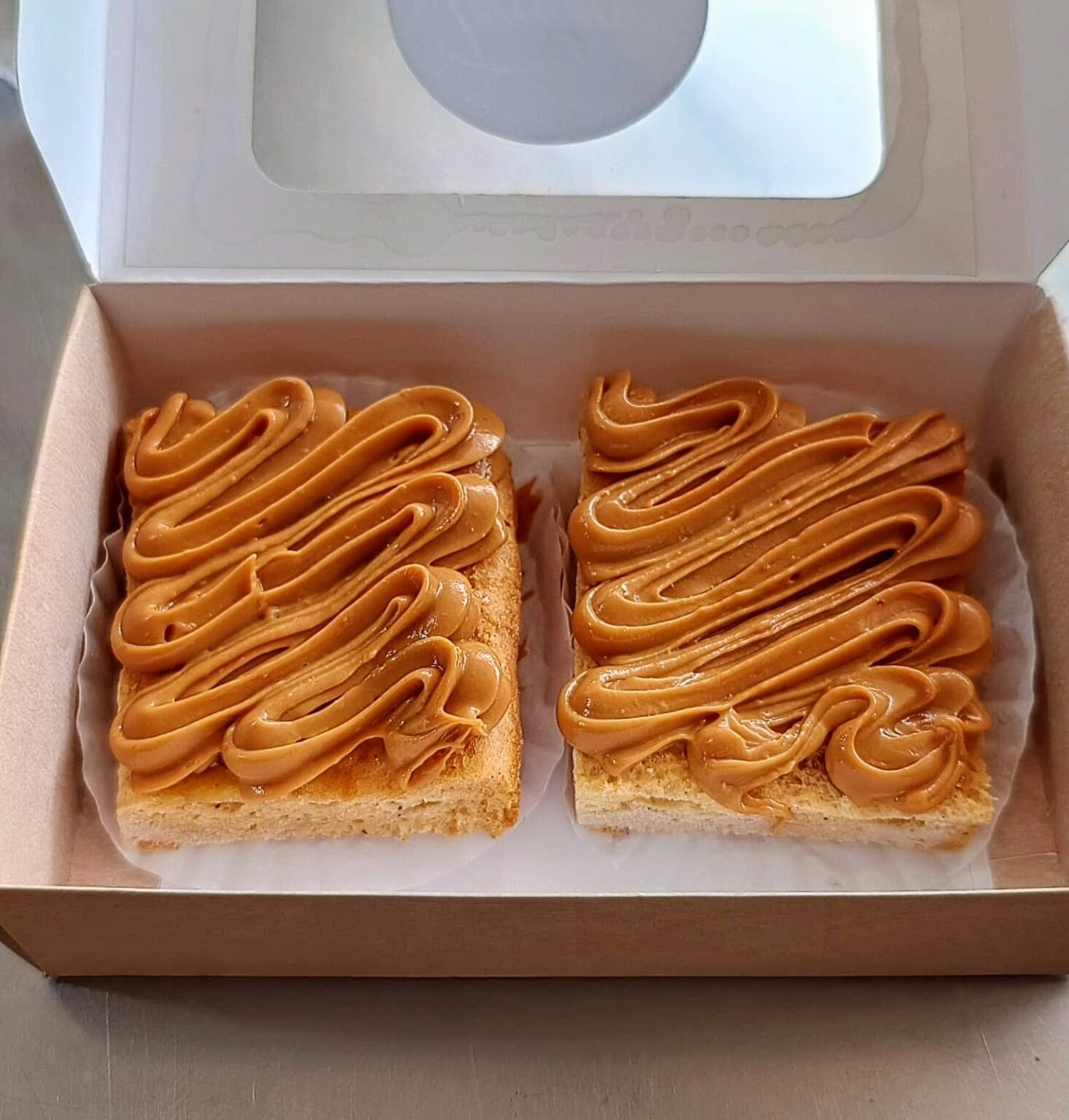 Delicioso y melcochudo bizcocho hecho con una mezcla de harina de almendras, harina de arroz, arequipe y chocolate semiamargo, con doble capa de arequipe cero azúcar.
