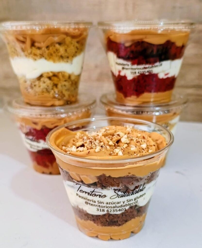 Postre húmedo con arequipe endulzado con stevia, torta sin gluten y almendras trituradas. Vaso de 9 onzas