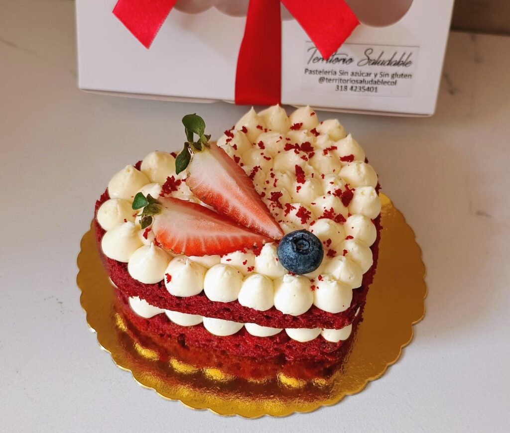 - Torta personal Red Velvet rellena de arequipe cero azúcar, decorada con chantilly hecha a base de yogurt griego.
