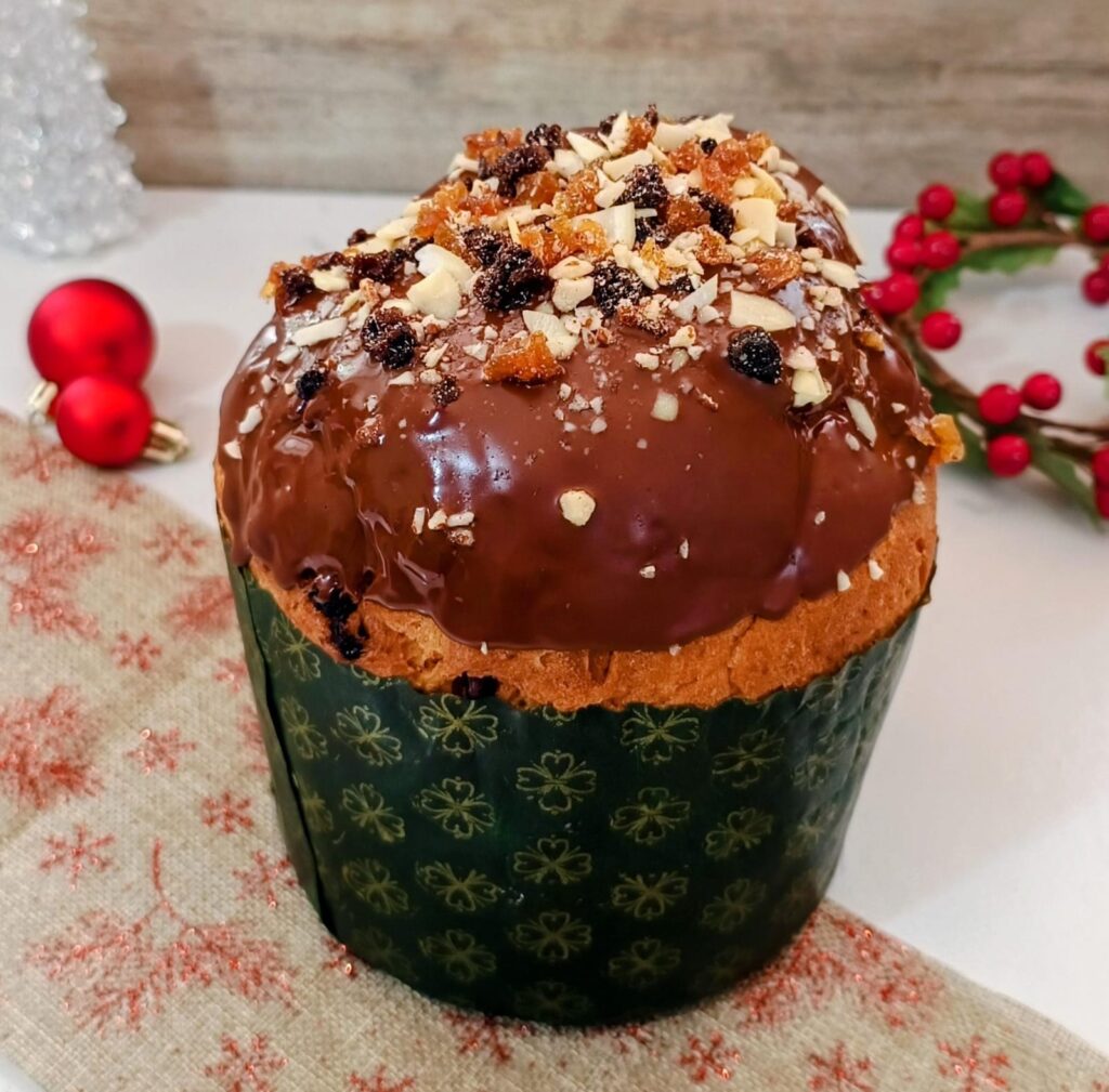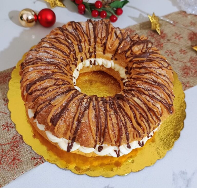 Suave bizcocho envinado, hecho con una mezcla de chocolate semiamargo, arequipe y frutos secos. Decorada con chocolate blanco, Corona de frutos secos (nueces pecanas, uva rubia, uva pasa, almendras laminadas, almendras trituradas. 100% endulzada con Stevia y libre de trigo.